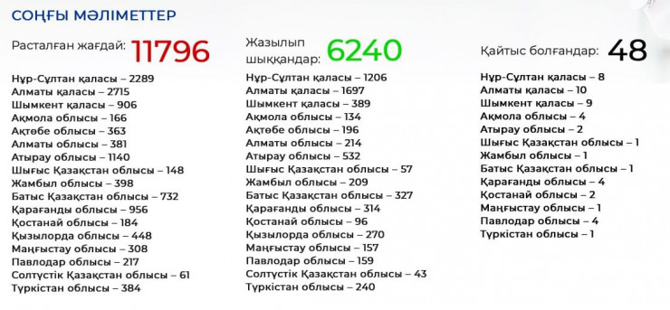 В Казахстане, по данным на вечер 3 июня, число подтвержденных случаев коронавируса составило 11 796, выздоровели 6240 человек, скончались 48 пациентов.
