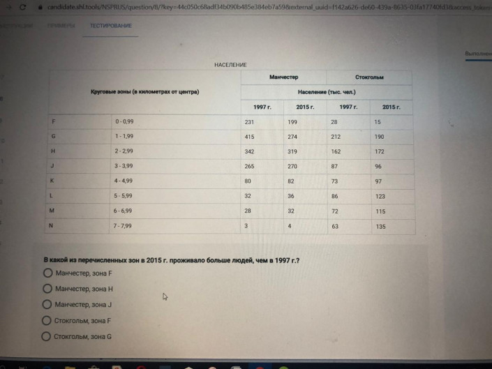 Следующее задание. Кандидату нужно было определить по диаграммам долю импорта фруктов и ягод при условии, что объемы не изменились за год. Далее требовалось рассчитать по таблице, в какой из зон в 2015 году проживало больше людей, чем в 2017 году.