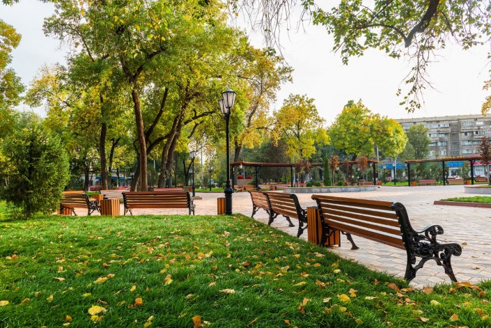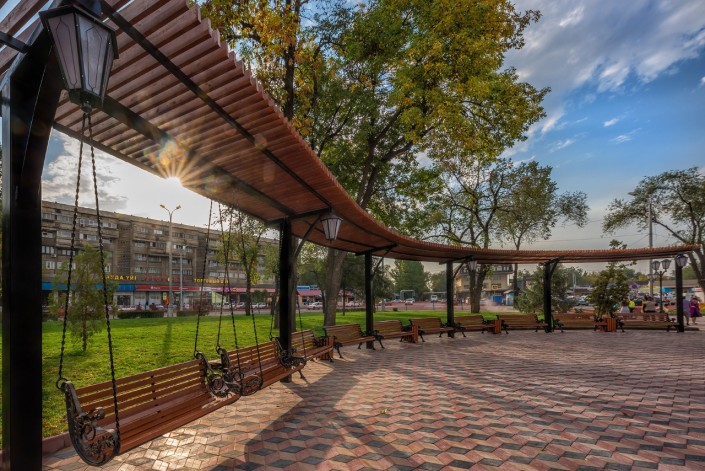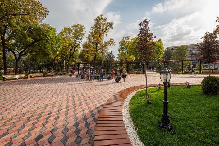 Здесь уложили тротуарную плитку, расширили площадь озеленения и высадили более 40 деревьев. Также установили малые архитектурные формы, обновили облицовку памятника Алиби Жангильдину и установили камеры видеонаблюдения.