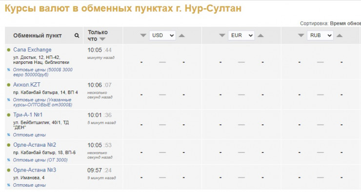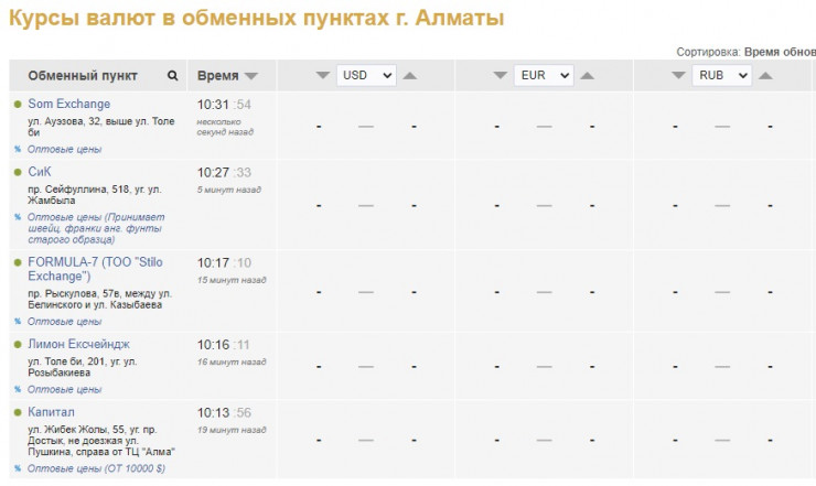 По данным на сайте kurs.kz, валюту не продает и не скупает ни один обменник Алматы.