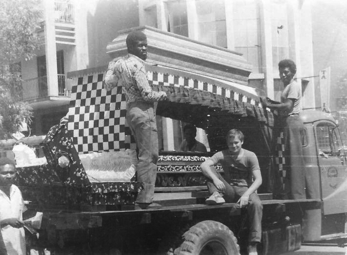 Ангола. Евгений Ерохов на параде 1 мая. Инсталляция работников похоронной мастерской. 1979 год
