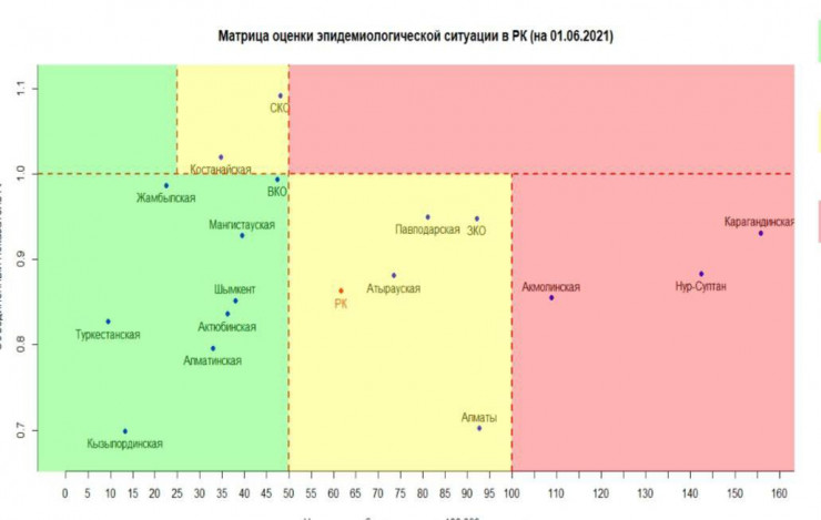 Согласно матрице оценки эпидемиологической ситуации в регионах Казахстана на 1 июня в "красной" зоне находятся Нур-Султан, Акмолинская, Карагандинская области.