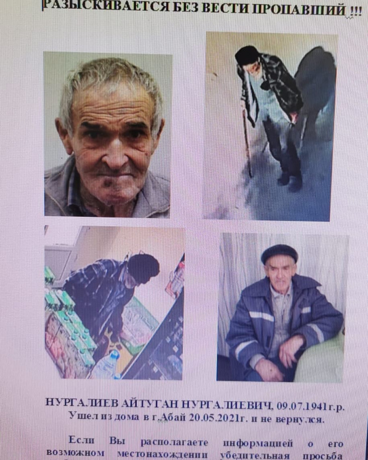 О пропаже Нургалиева Айтугана в полицию заявляли его близкие. 20 мая пенсионер вышел из дома в неизвестном направлении и бесследно исчез.
