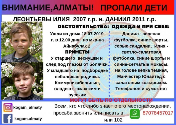 По рассказу матери, сыновья вышли из дома 18 июля в 12.00 дня в районе микрорайона Айнабулак-2 и не вернулись. Старшему из братьев - 12 лет, младшему - восемь.