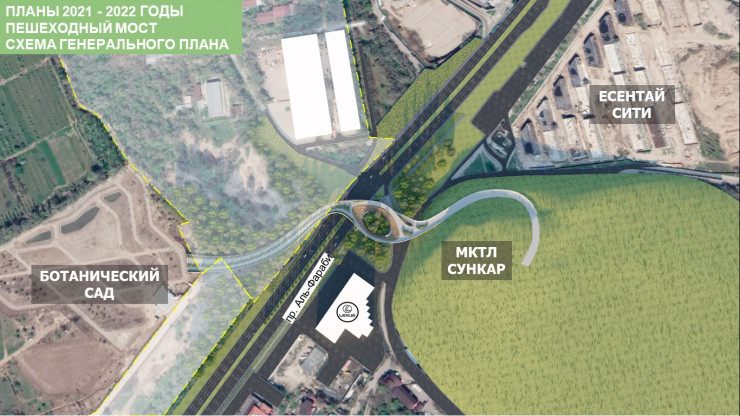 Самый необычный проект на проспекте Аль-Фараби, пожалуй, зеленый мост, который будет соединять Ботанический сад и новый парк, который будет располагаться на холмах.