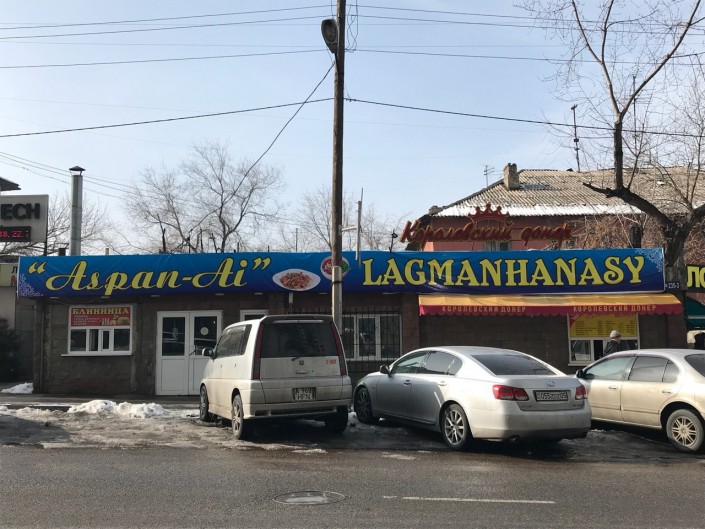 Вывеска лагманной на улице Тургута Озала выше проспекта Абая. Владельцы заведения отмечают, что вывеска на латинице появилась после того, как стало известно о переходе казахского алфавита на латиницу.