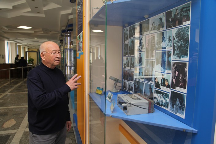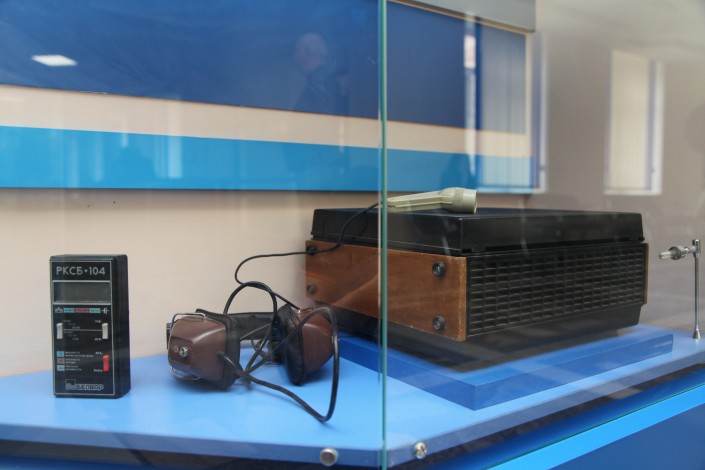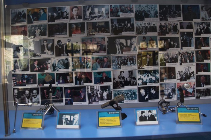 "Бұл 1970 жылдары қолданылған МД-54 микрофоны. Әкем бұл микрофонмен тікелей эфирде мәтін оқыған. МД-12 деген кішкентай микрофон да болды. Оның алдында қолданғандары, өкінішке қарай, қазір жоқ. Бәрін таратып алып кеткен. Бұлар - қалғаны, қолдан жинағанымыз", - дейді ардагер инженер, Ә.Байжанбаевтың ұлы Арыс Байжанбаев сөредегі микрофондарды нұсқап.