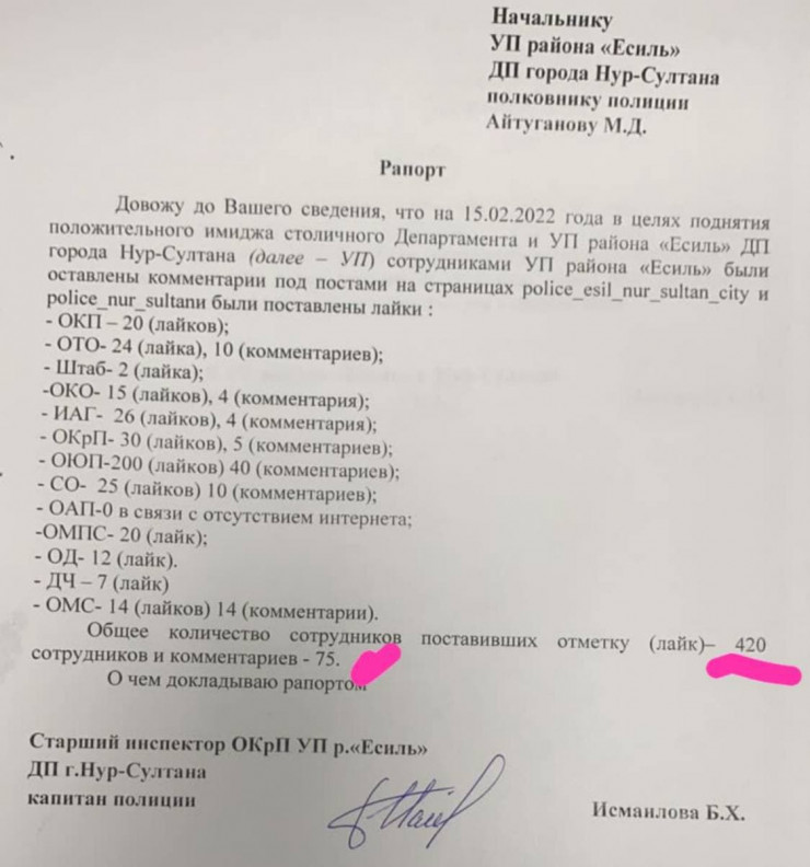 Казахстанцы рассылают в мессенджерах и социальных сетях фотографию предполагаемого рапорта на имя начальника столичной полиции района Есиль полковника Мадияра Айтуганова.
