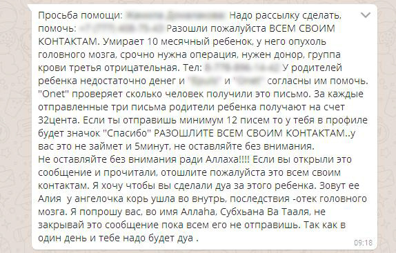 Неизвестные активно распространяют в WhatsApp сообщение от женщины о помощи для десятимесячного ребенка с опухолью мозга, которому срочно нужна кровь для операции, передает корреспондент Tengrinews.kz.