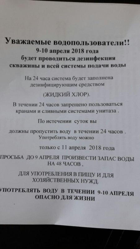 "9-10 апреля будет проводиться дезинфекция скважины и всей системы подачи воды. На 24 часа система будет заполнена дезинфецирующим средством (жидкий хлор). В течение 24 часов запрещено пользоваться кранами и сливными системами унитаза. (...) Просьба до 9 апреля произвести запас воды на 48 часов, для употребления в пищу и для хозяйственных нужд. Употреблять воду в течение 9-10 апреля опасно для жизни, - говорится в сообщении.