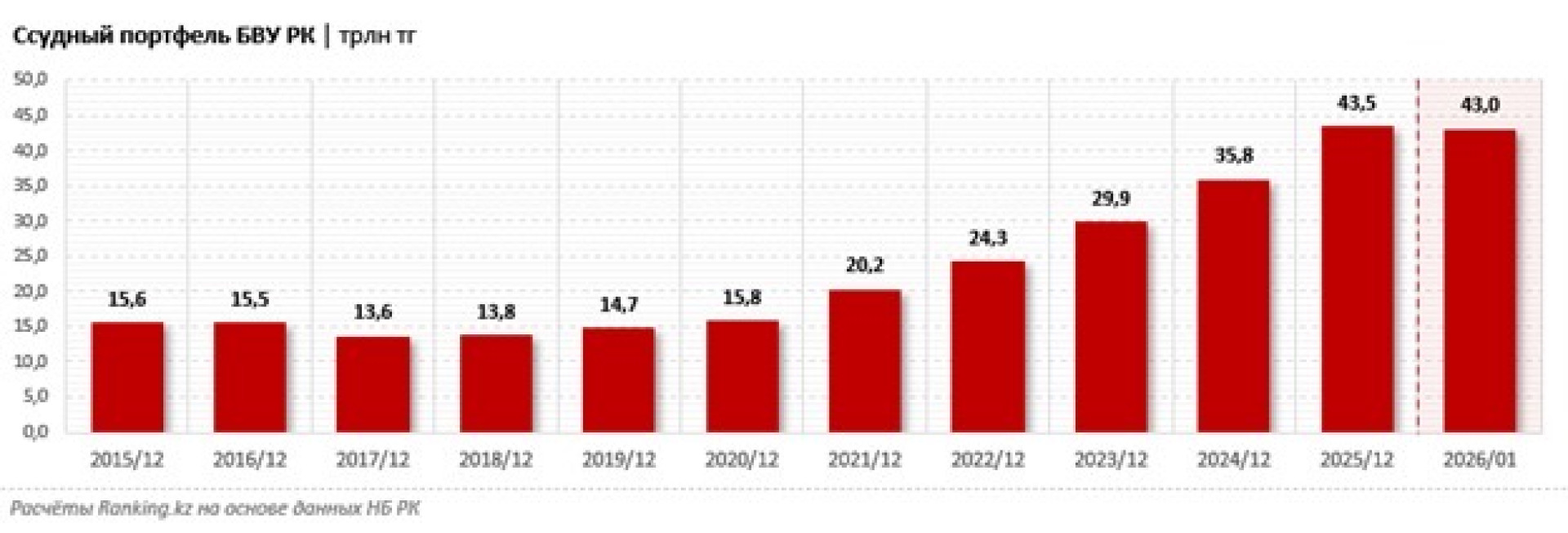 Как отмечает аналитический портал, совокупный ссудный портфель банков второго уровня Казахстана по итогам 2025 года достиг рекордных 43,5 триллиона тенге, увеличившись на 21,3 процента. За последние пять лет этот показатель вырос почти втрое.