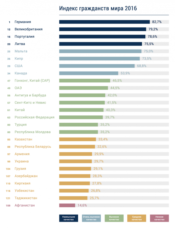 Первое место в рейтинге заняла Германия. Второе место разделили Дания и Франция. Кроме того, в пятерку лидеров вошли Исландия, Швеция и Норвегия. Самыми непривлекательными странами для получения гражданства оказались Центральноафриканская Республика и Афганистан.