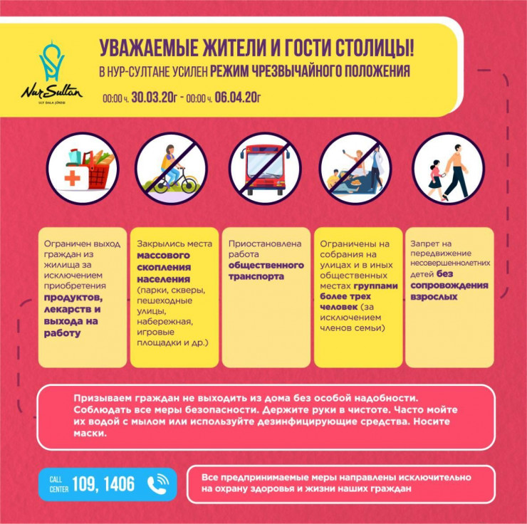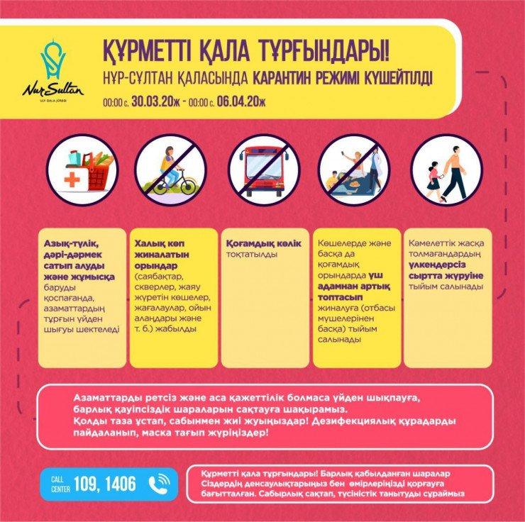 С 30 марта режим чрезвычайного положения в столице Казахстана усилен. Перестанут ездить автобусы, вводится нерабочая неделя, за исключением работы медиков, полицейских и тех, кто обеспечивает жизнедеятельность города. Акиматом города для медиков, борющихся с коронавирусом, выделены гостиницы, транспорт и организовано питание. Для врачей, работающих в поликлиниках и больницах, также организован транспорт.