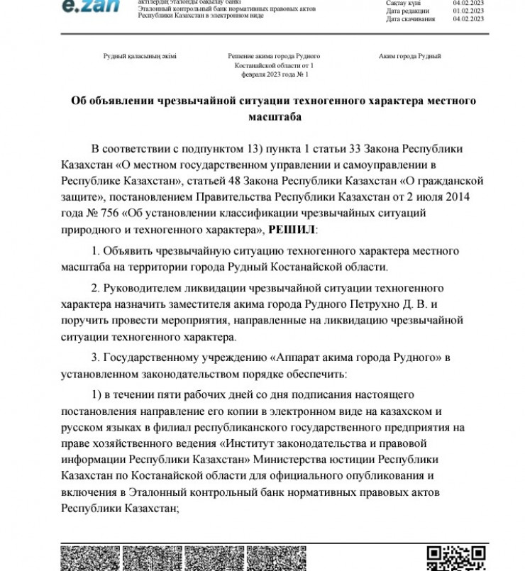 Ранее в социальных сетях появился документ, в котором говорится о введении в Рудном режима ЧС техногенного характера местного масштаба.
