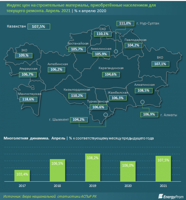 Среди регионов Казахстана подорожание стройматериалов варьируется от 4,2 процента в Шымкенте и Павлодарской области до ощутимых 18,6 процента в Мангистауской области.