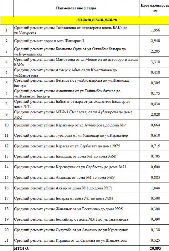 В Бостандыкском районе, наоборот, вместо изначально запланированных 20 улиц работы начали на 25. Ремонт все еще идет на шести улицах (в таблице они отмечены желтым цветом).