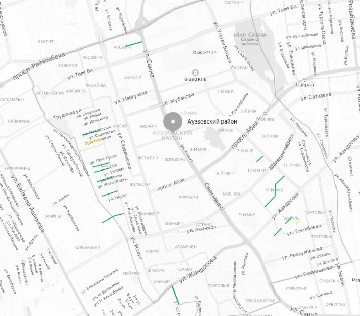 А вот в Ауэзовском районе ремонтировали 13 улиц вместо запланированных ранее 16. Ремонт так и не дошел до транспортных развязок на пересечении улиц Саина и Жандосова, улицы Саина и проспекта Абая, улиц Саина и Шаляпина. Кроме того, ремонт все еще идет на внутриквартальном проезде от улицы Шалова до школы № 127 и на улице Тургенская от улицы Яссауи до дома № 78.