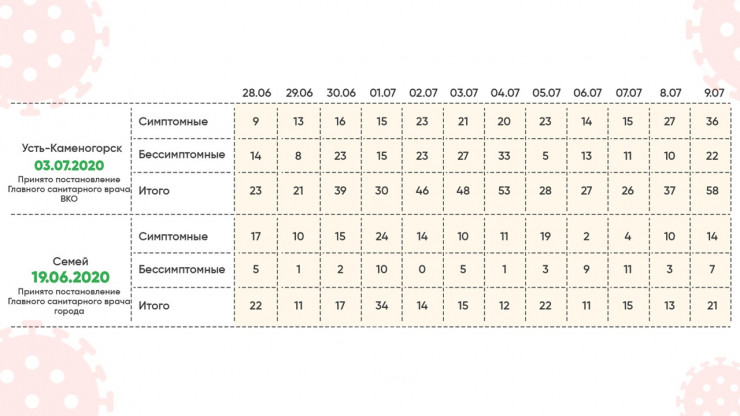 Так, 28 июня количество заболевших составило: в Семее – 22, в Усть-Каменогорске – 23. 29 июня в Семее зафиксировано 11, в областном центре – 21 новый случай заражения. Данные за 30 июня показывают резкий скачок количества заболевших в Усть-Каменогорске – 39, в то время как в Семее зафиксировано 17 человек. 1 июля в Семее зарегистрировано 34 случая заражения КВИ, в Усть-Каменогорске – 30.