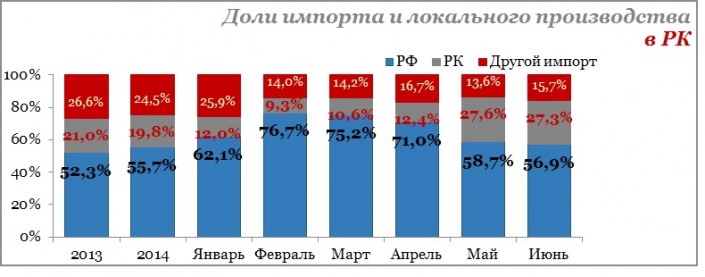 По данным экспертов ассоциации, в июне, по сравнению с маем 2015 года, доля автомобилей российского производства на казахстанском рынке снизилась практически на два процента и составила 56,9. В сравнении с февралем 2015 года доля рынка продаж российских автомобилей снизилась на 20 процентов - 5060 единиц.  Потеряли свои позиции модели Lada, Hyundai, Kia и Uaz, произведенные в РФ.