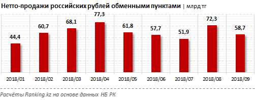 Объeм нетто-продажи (продажа валюты минус покупка) обменными пунктами российских рублей за январь-сентябрь 2018 года составил 552,8 миллиарда тенге.