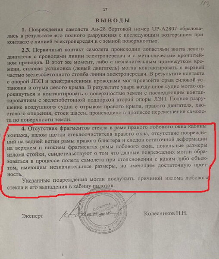 Кроме того, отец погибшего летчика Евгения Кутафина считает, что самолет могли обстрелять с земли. Маршрут Ан-28 проходил прямо над военным полигоном. Газета "Время" опубликовала документ, который может это подтвердить. В нем говорится, что лобовое окно кабины самолета было выбито. Характер повреждений говорит о том, что якобы самолет столкнулся с незначительным по размеру, "но имеющим достаточную прочность" объектом.