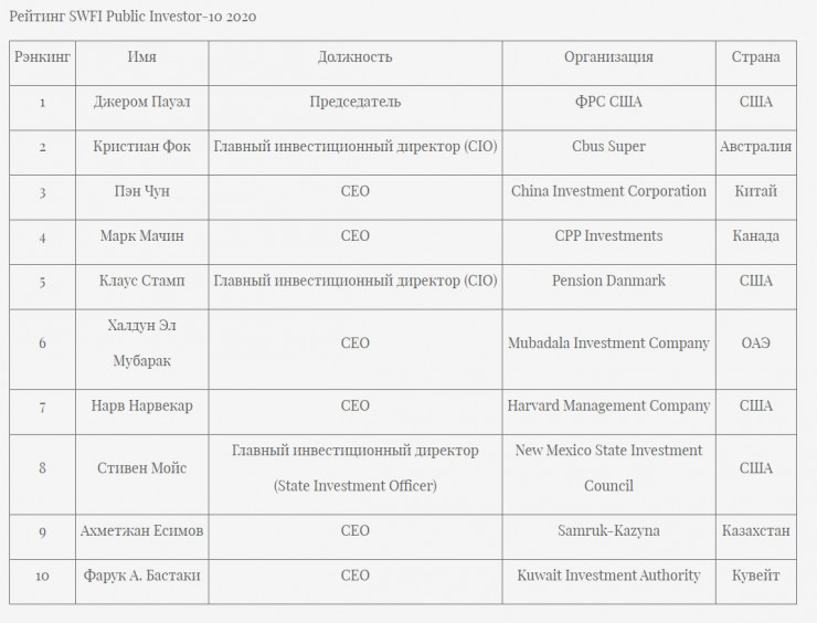 Отмечается, что председатель правления АО "ФНБ "Самрук-Казына" Ахметжан Есимов вошел в топ-10 руководителей инвестиционных организаций наряду с председателем Федеральной резервной системы США и первыми руководителями мировых суверенных фондов, включая Китайскую инвестиционную корпорацию (CIC), Суверенный фонд ОАЭ Mubadala (Mubadala Investment Company), а также Фонд национального благосостояния Кувейта (Kuwait Investment Authority).