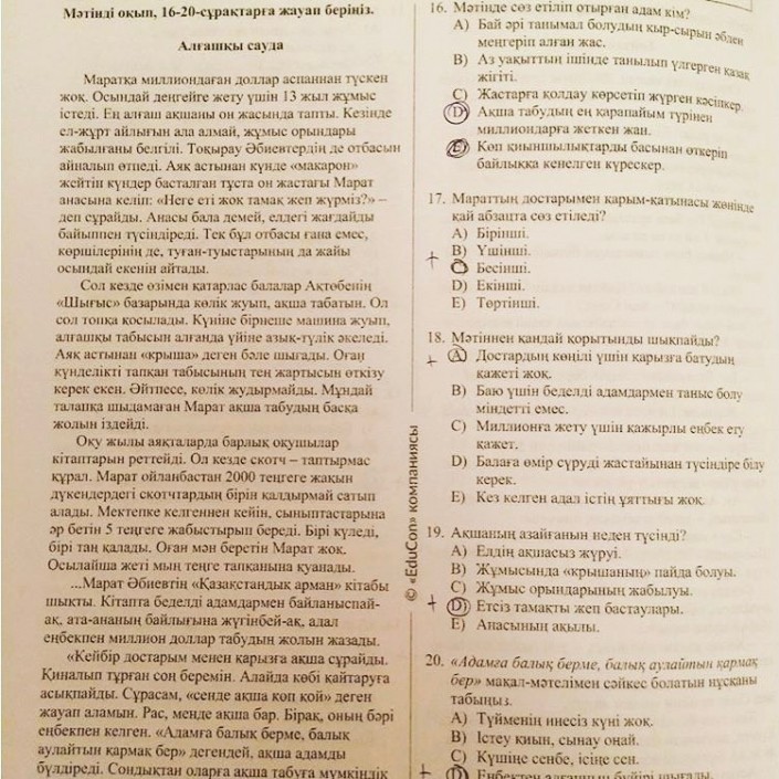 Между тем в Национальном центре тестирования сообщили, что данный опросник является материалом частного учебного центра. "Частные центры часто разрабатывают свои вопросы. Этот опросник является их разработкой. Это их текст и их вопросы. Данная часть тестируемого материала взята из нового формата ЕНТ. А именно направление "читательская грамотность", которая заменяет на ЕНТ казахский язык и литературу. И "читательская грамотность" - один из главных предметов на ЕНТ. На самом ЕНТ этого текста и вопроса не будет, так как это разработка частной компании", - отметила руководитель отдела информации и аналитики Асель Шарбекова.