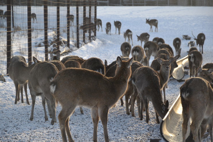 На ферме мы увидели забор из металлической решетки, возле ворот, заметив своих кормильцев, собрались стада оленей. Площадь их обитания - 600 гектаров. В ней они никак не ограничены и приходят к месту кормежки раз в день. Все остальное время они бродят в лесу в поисках корма и просто гуляя. Ферма разделена на пять парков. Отдельно содержатся беременные самки и самки с оленятами, отдельно самцы, отдельно молодняк, чтобы взрослые особи не отбирали у них еду.