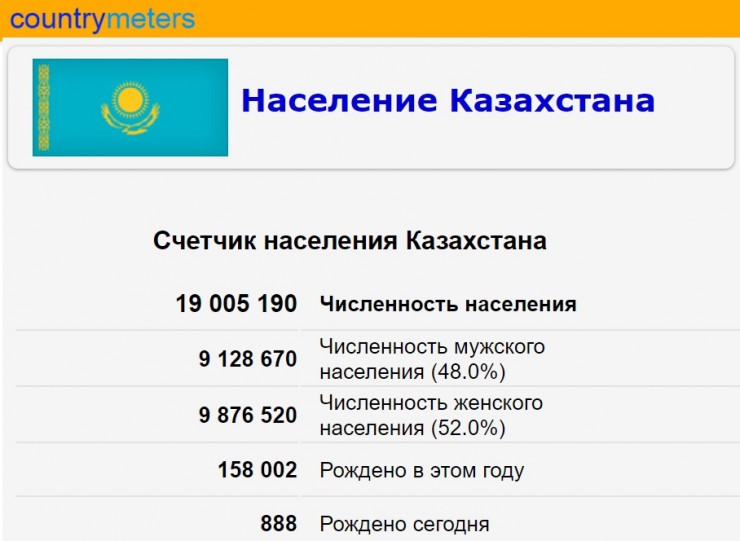 Countrymeters.info ведет неофициальный подсчет численности населения мира. Статистические данные сайта о Казахстане, по данным на вечер 15 мая, отображают, что количество жителей страны якобы перевалило за 19 миллионов.