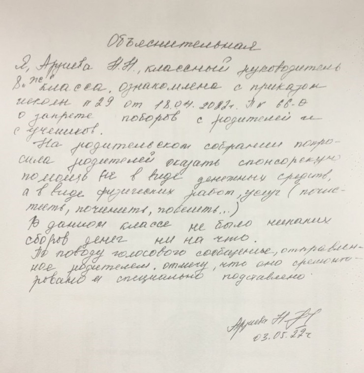 Отправила руководитель отдела образования и фотографию объяснительной. В ней классный руководитель еще раз сообщает, что это не поборы. А аудиозапись учительница и вовсе назвала "сремонтированной", имея в виду, что сообщение является смонтированным.