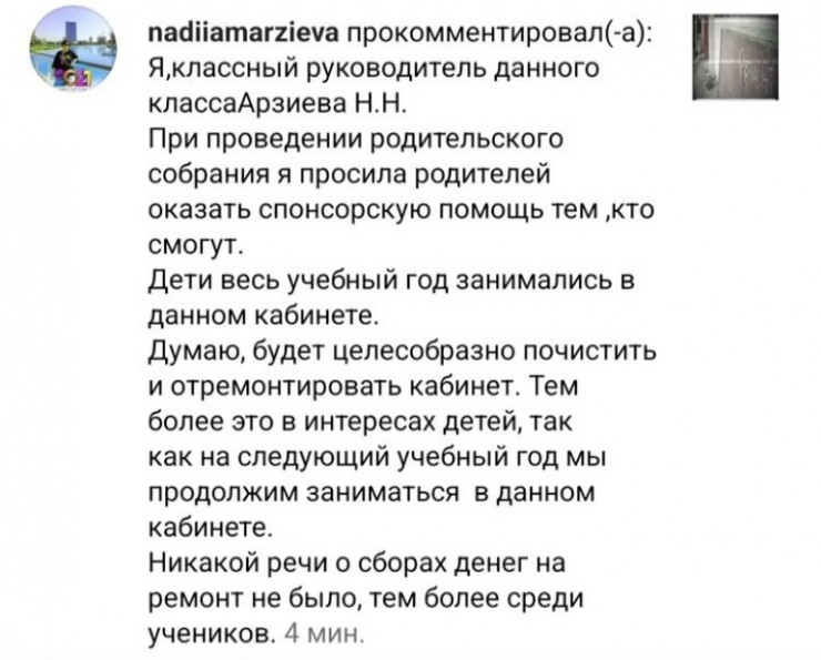 "Я классный руководитель данного класса Арзиева Н.Н., при проведении родительского собрания я просила родителей оказать спонсорскую помощь, тех, кто сможет. Дети весь учебный год занимались в данном кабинете. Думаю, будет целесообразно почистить и отремонтировать кабинет. Тем более это в интересах детей, так как на следующий учебный год мы продолжим заниматься в данном кабинете. Никакой речи о сборе денег на ремонт не было, тем более среди учеников", - рассказала учительница.