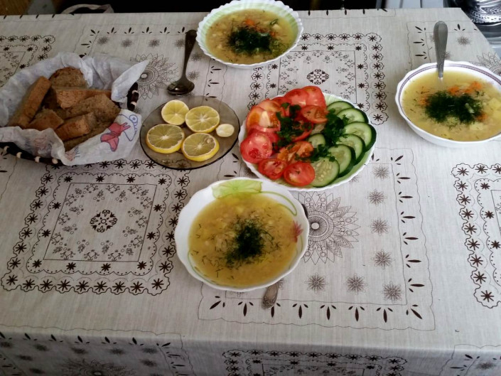 Семья Тлеубаевых совмещает обед и ужин. После 16.00 "едят" только воду, максимум с добавлением лимонного сока. В качестве перекуса могут быть фрукты. Но это касается только взрослых членов семьи. Веганы очень бережно относятся к воде - не льют попусту, во время мытья посуды включают тонкой струйкой. Динара Тлеубаева уверена, что экономить можно при любом достатке.