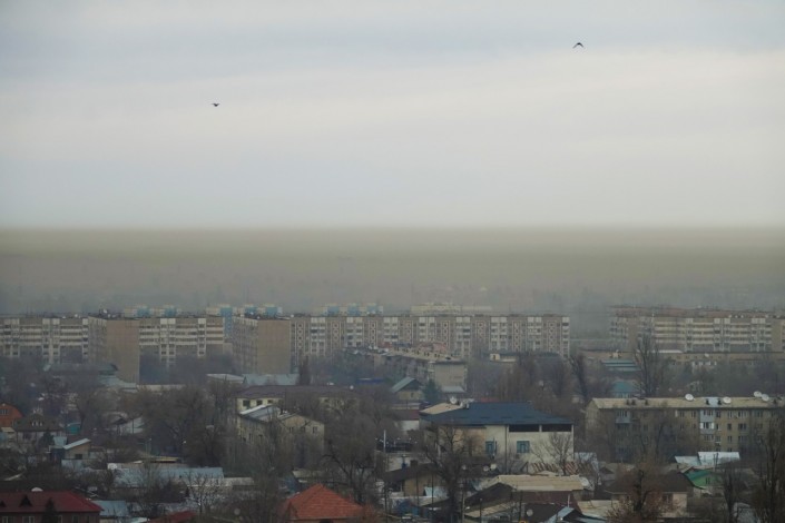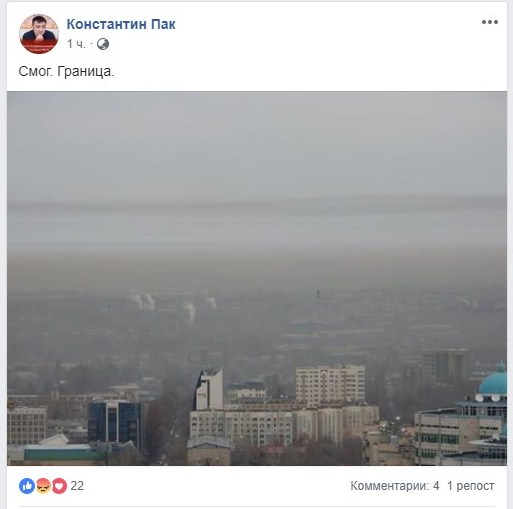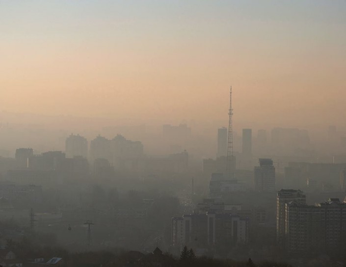 Серо-коричневый смог сегодня наблюдается в нижней части города. Визуально это выглядит как полоса пыли.