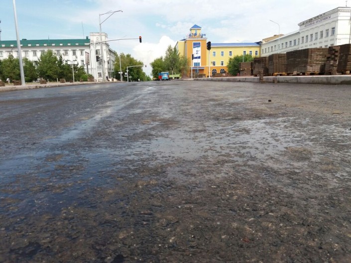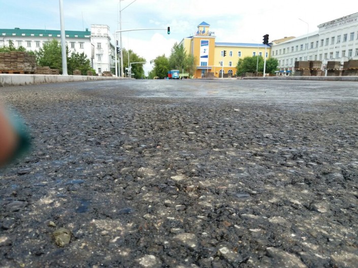 Видео в сети разместил пользователь под именем Данияр Еникей. Он подписал кадры словами: "В Караганде кладут асфальт несмотря на дождь". На кадрах запечатлена техника, которая раскатывает асфальт в дождь. Над асфальтом вьется пар. Корреспондент Tengrinews.kz побывал на площади Гагарина, которая сейчас перекрыта из-за ремонта. Здесь множество спецтехники, укладка асфальта уже не производится. Идет дождь. Асфальт очень теплый, немного рыхлый и подошва обуви слегка прилипает к нему.