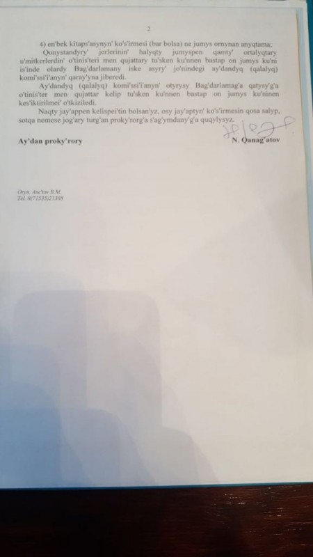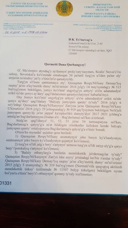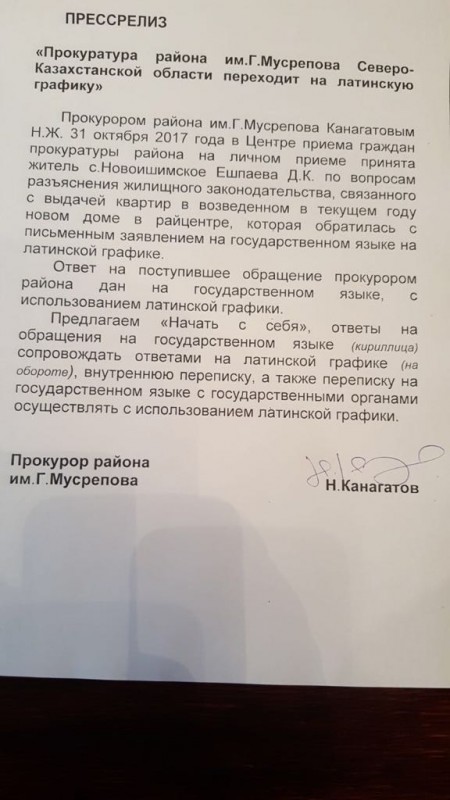 Первый такой документ написан в Северо-Казахстанской области. Этот ответ прокуратуры района имени Габита Мусрепова на поступившее обращение от гражданского лица. В надзорном ведомстве призывают "начать с себя" и писать ответы на обращения граждан, а также вести внутреннюю переписку и переписку с государственными органами с помощью латинской графики.