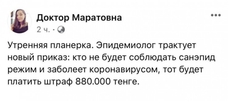 В Сети появилось сообщение врача из Нур-Султана, которая заявила о том, что теперь докторов, заразившихся коронавирусом, будут штрафовать на 880 тысяч тенге, передает Tengrinews.kz со ссылкой на Stopfake.kz.