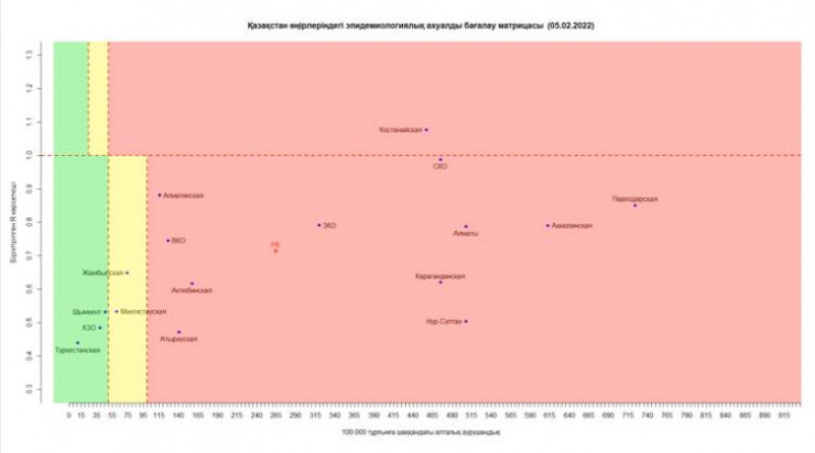 Согласно матрице, 5 февраля 2022 года в "красной" зоне: города Нур-Султан, Алматы, Атырауская, Алматинская, Акмолинская, Актюбинская, Восточно-Казахстанская, Западно-Казахстанская, Карагандинская, Костанайская, Павлодарская, Северо-Казахстанская области.