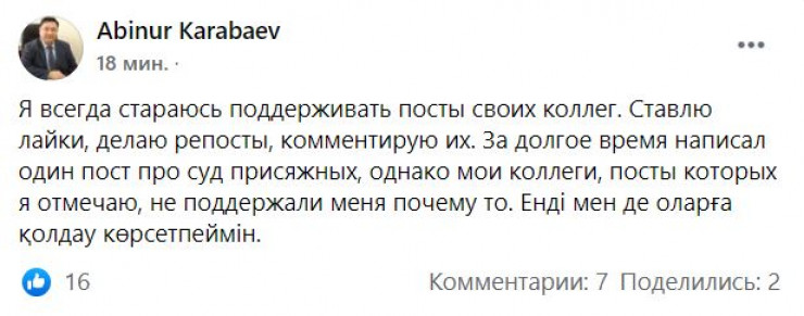 "Я всегда стараюсь поддерживать посты своих коллег. Ставлю лайки, делаю репосты, комментирую их. За долгое время написал один пост про суд присяжных, однако мои коллеги, посты которых я отмечаю, не поддержали меня почему-то. Енді мен де оларға қолдау көрсетпеймін (Теперь я тоже не буду их поддерживать - перевод редакции)", - написал он.