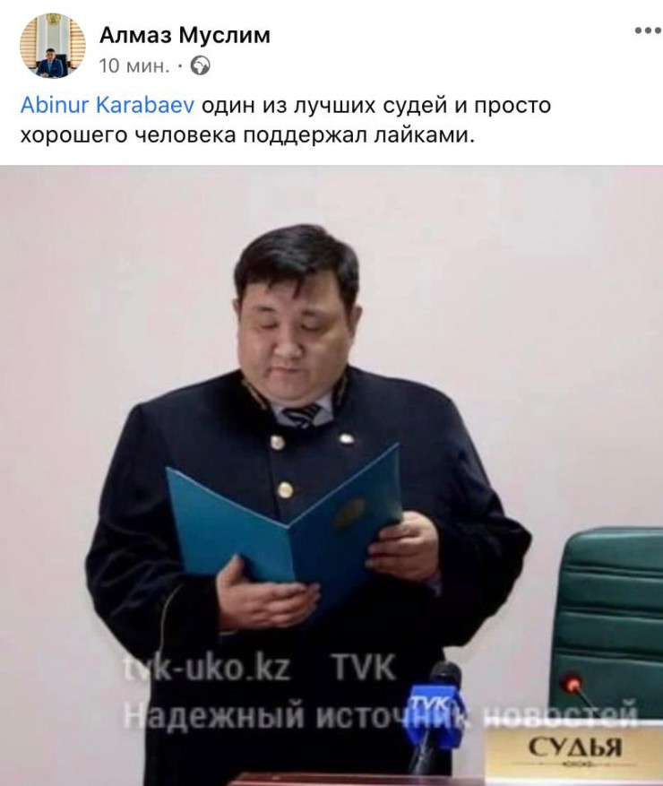 Судья СМУС Шымкента Абинур Карабаев разместил на своей странице в Facebook пост, в котором говорит о коллегах, не желающих ставить ему лайки и оставлять комментарии, передает Tengrinews.kz со ссылкой на Elitar.kz.