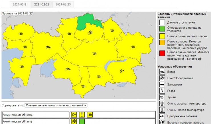 Синоптики составили карту предупреждений погодных явлений в Казахстане на 22 февраля. По данным Казгидромета, большая часть страны в "желтой зоне", что говорит о потенциально опасной погоде, передает Tengrinews.kz.