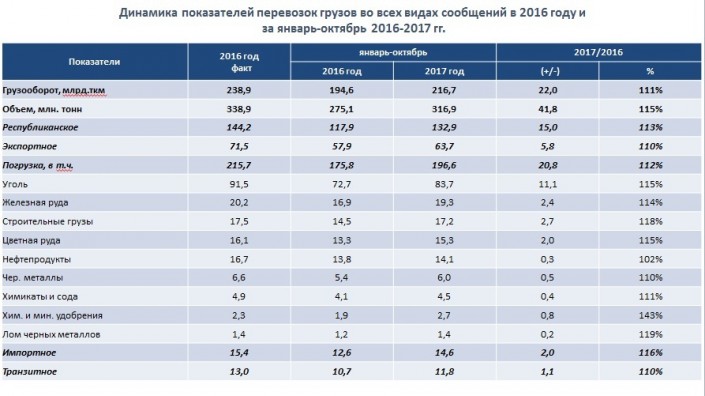 По словам председателя правления АО "КТЖ - Грузовые перевозки" Оралхана Кулакова, в текущем году наблюдается динамика роста перевозок по всем видам сообщений за счет увеличения перевозок угля, железной руды, строительных грузов, химикатов и удобрений.