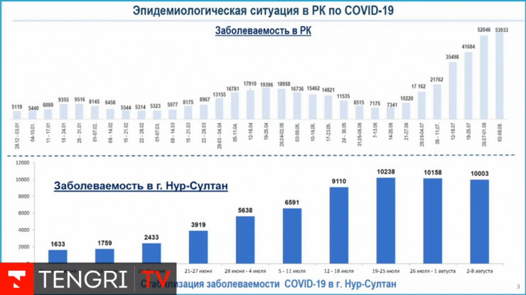 "В Казахстане прирост за неделю составил 10 процентов. В Казахстане в связи с выявлением дельта-штамма зарегистрирован подъем заболеваемости, но с начала августа отмечается замедление роста заболеваемости коронавирусной инфекцией и стабилизация эпидситуации по COVID-19 в Нур-Султане", - сообщил Цой на заседании правительства.