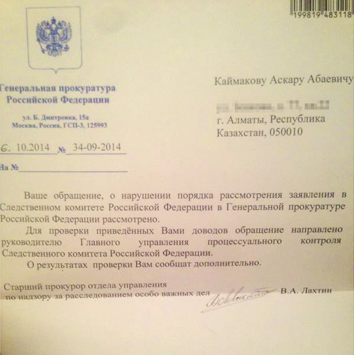 В связи с этим еще в марте 2014 года Каймаков попросил Генеральную прокуратуру России принять меры. Позже надзорный орган сообщил казахстанцу о том, что его обращение в связи с высказываниями Владимира Жириновского передано в Следственный комитет РФ для дальнейшего рассмотрения, однако с тех пор никакого ответа он не получал. Юрист был вынужден направить повторную жалобу, но уже о том, что Следственный комитет бездействует. На днях Каймаков получил от Генпрокуратуры ответ.