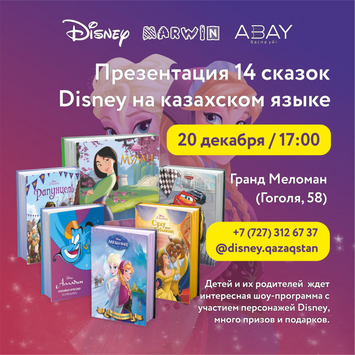 20 декабря в Алматы состоится первая в Казахстане презентация книг Disney на казахском языке, передает Tengrinews.kz со ссылкой на издательский дом Abay Books.