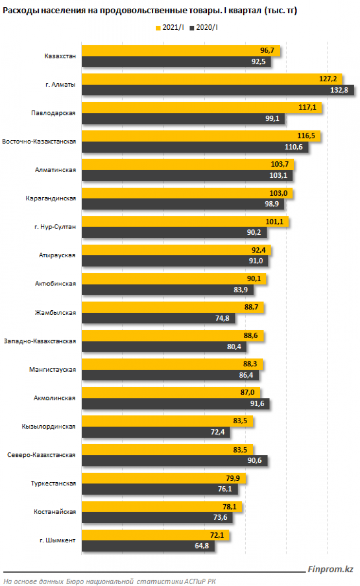 Заметим, что только в трех из 17 регионов страны наблюдалось сокращение расходов на продовольственные товары в сравнении с прошлым годом: в Северо-Казахстанской и Акмолинской областях, а также в Алматы.