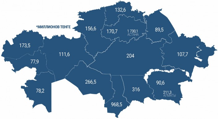 По состоянию на 1 июля 2017 года, на оплату арендуемых помещений и зданий у физических и негосударственных юридических лиц для государственного аппарата из местного бюджета уже перечислено  2 309 830 100 тенге.
