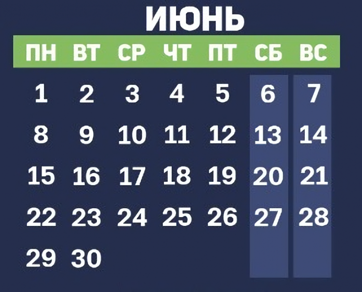В предстоящем месяце 30 дней, и они растянулись на пять недель. На четыре из них выпадают выходные дни. Соответственно, отдых придется на восемь дней - на 6, 7, 13, 14, 20, 21, 27 и 28 июня.