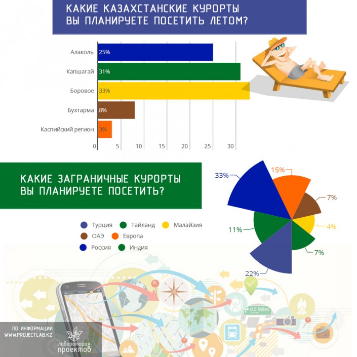 Также согласно исследованию, 33 процента респондентов отметили, что планируют посетить летом Боровое в Акмолинской области, 31 процент казахстанцев поедет на Капшагайское водохранилище, 25 процентов собираются провести летний отпуск на Алаколе.
