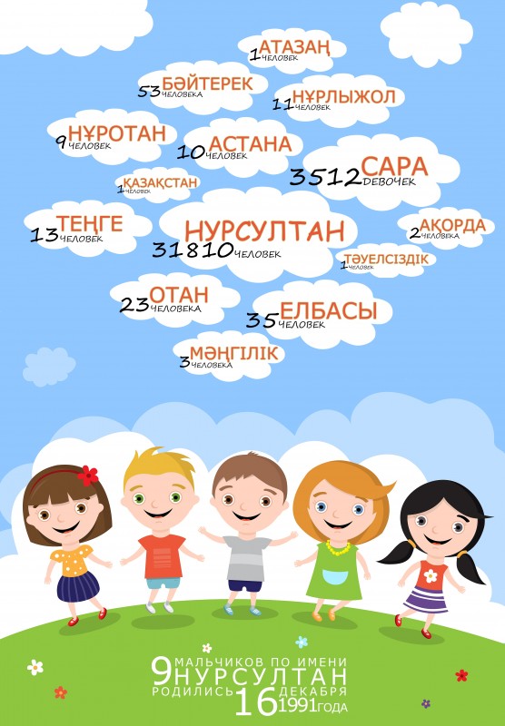 В Комитете статистики МНЭ РК озвучили данные по наиболее популярным и необычным именам, которые давали новорожденным казахстанцам за 25 лет независимости. Как сообщили на официальный запрос Tengrinews.kz в Комитете статистики, сейчас в Казахстане проживают 31 810 человек с именем Нурсултан. Из них девять человек родились 16 декабря 1991 года. Именем первой леди Казахстана - Сара - названо 3 512 девочек.