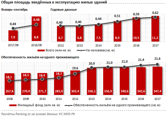 Жилстрой в РК уверенно развивается. Объемы ввода жилья в эксплуатацию выросли за год на 11,6 процента, до 8,8 миллиона квадратных метров, по итогам января-сентября 2018. Ввод жилой площади на душу населения в этом периоде также увеличился: на 10,1 процента за год, до 0,48 квадратных метра на человека.